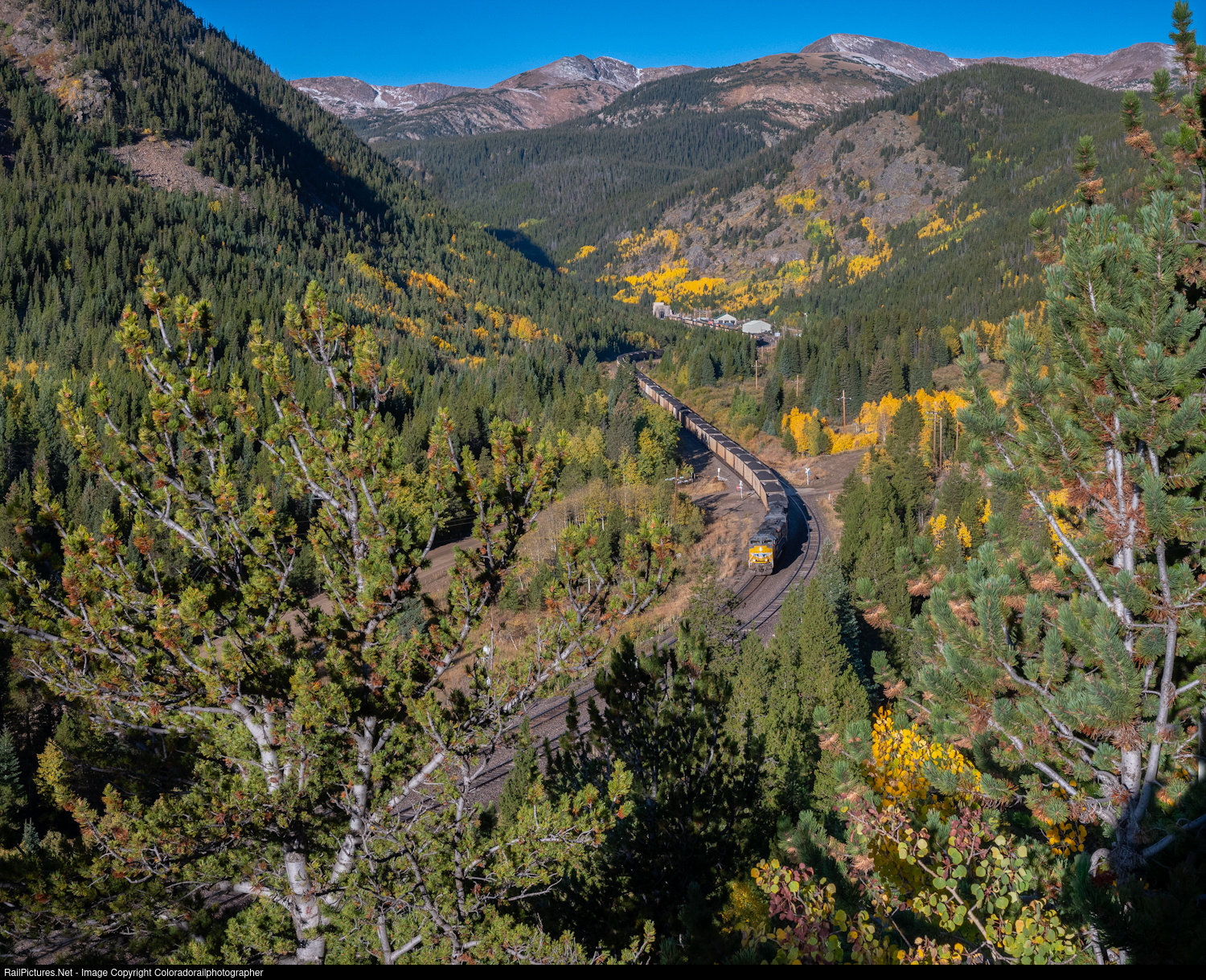 Eastbound coal load at East Portal - passing siding 75 cars MP.49.83 Center Siding. Fall and winter are mingling at this vibrant sunrise under the James Peak Wilderness and Rollins Pass. |