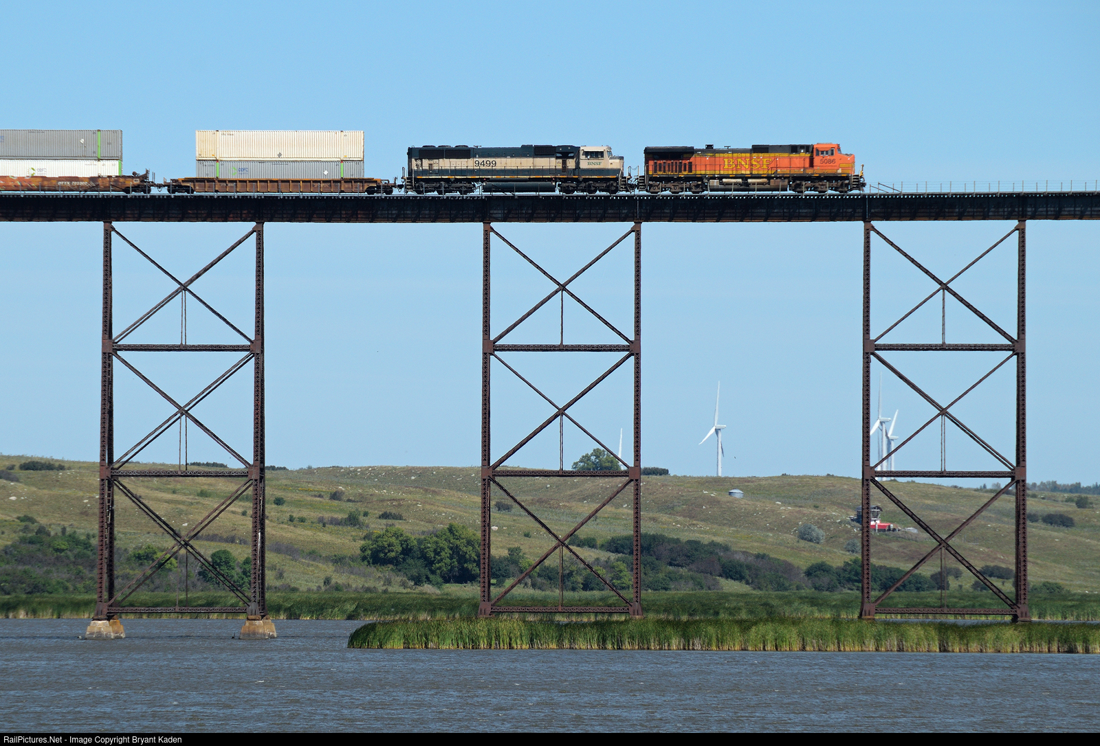 In a long-standing railroad tradition, older locomotives often make their last stand relegated to helper service, although nowadays they're simply known as "Distributed Power." Here, an EMD SD70MAC and a GE C44-9W are still racking up the miles as they shove a stack train across the BNSF's large bridge between Luverne and Karnak, North Dakota.
