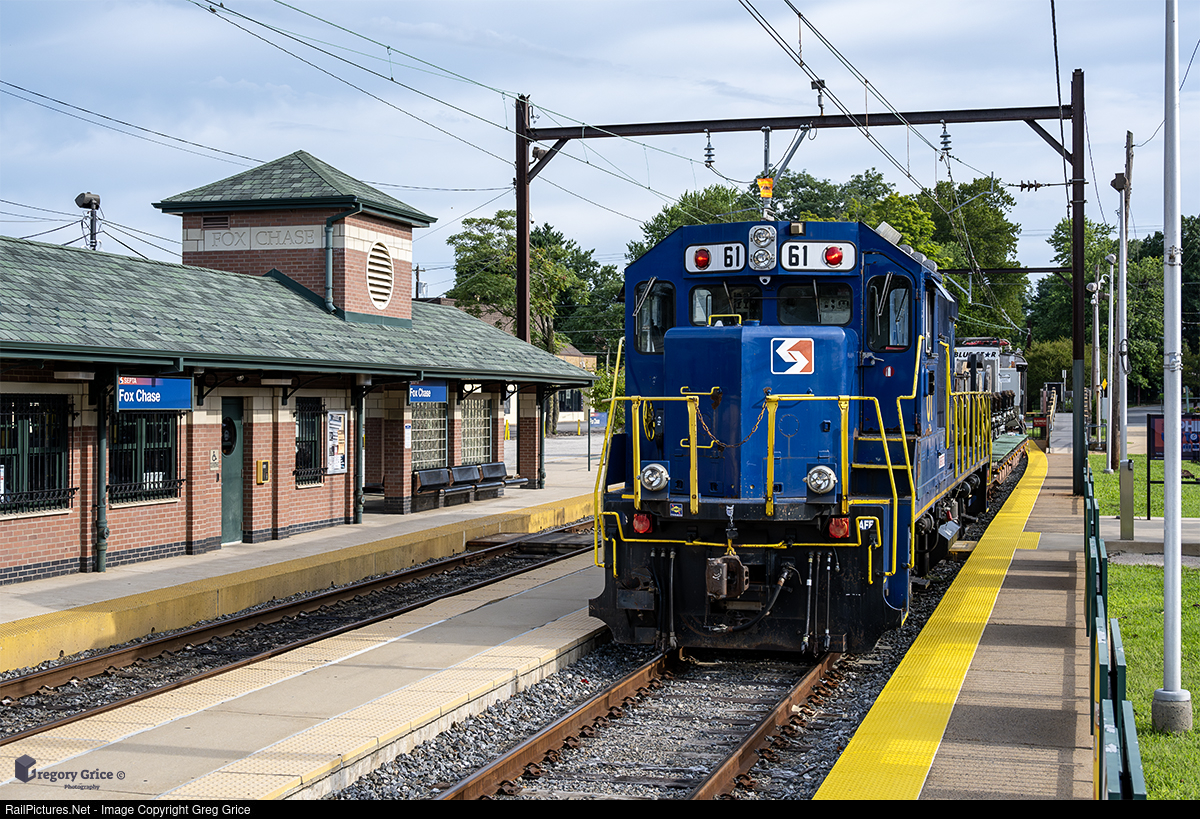 On the morning of August 11th, 2024, SEPTA Republic Locomotive RL1000 SPAX 61, sits on the point of a Wire Train at the end of the Fox Chase Line in Fox Chase, Pennsylvania. The train was laid up in the station while daytime crews performed various maintenance work along the line during a weekend shutdown.