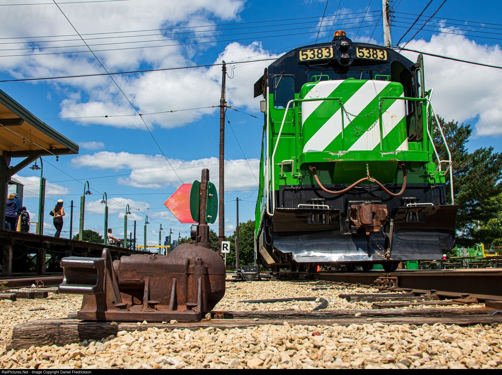 It's the Illinois Railway Museum's annual Diesel Days event, and on this Saturday the mainline trains were running primarily with hood units. Here, on the museum grounds, BN 5383 pauses at the Main Street pavilion after running a Take the Throttle session.
