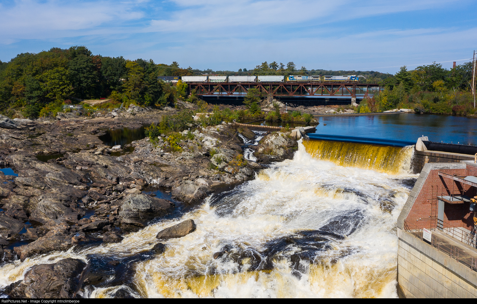| A pair of Pan Am Dash 8's, now once again operating under CSX, lead local freight L053 as it heads east on the Waterville Subdivision and crosses the Androscoggin River just above the Great Falls in Lewiston, Maine. This train out of Rigby Yard will meet its counterpart L054 at Leeds Junction to swap blocks of cars. |