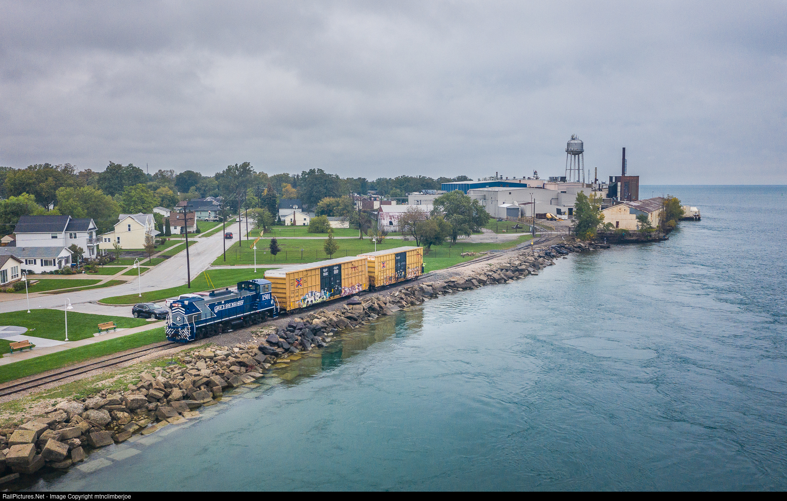 | On a gloomy day in Port Huron, Michigan, the Lake State Railway's Port Huron Job Y505 shuffles cars around at Dunn Paper with a solo MP15. The customer is located at the end of the line right along the banks of the St. Clair River's inlet from Lake Huron but has since relocated, leaving this unique streatch of track unused. |