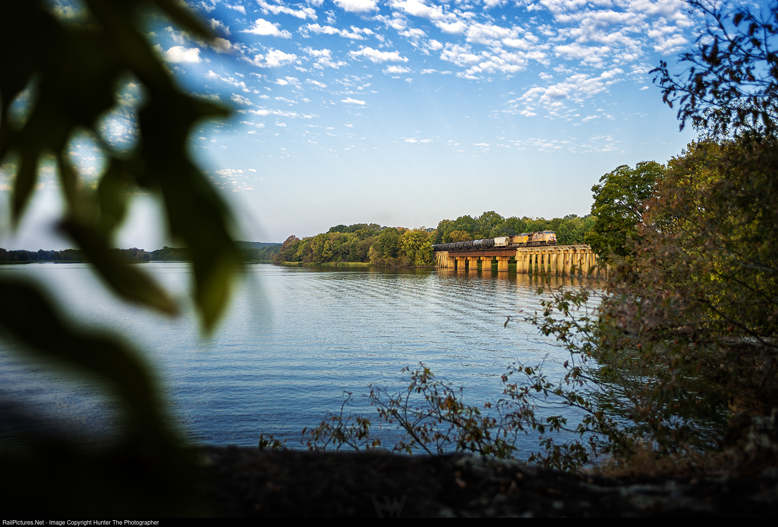 Sunday At Spadra | Crossing the bridge over the mouth of Spadra Creek at the Arkansas River just south of Clarksville, AR, a southbound Union Pacific train has just gotten underway after meeting a northbound manifest train at the Spadra siding on the partly cloudy morning of Sunday, October 13, 2024.