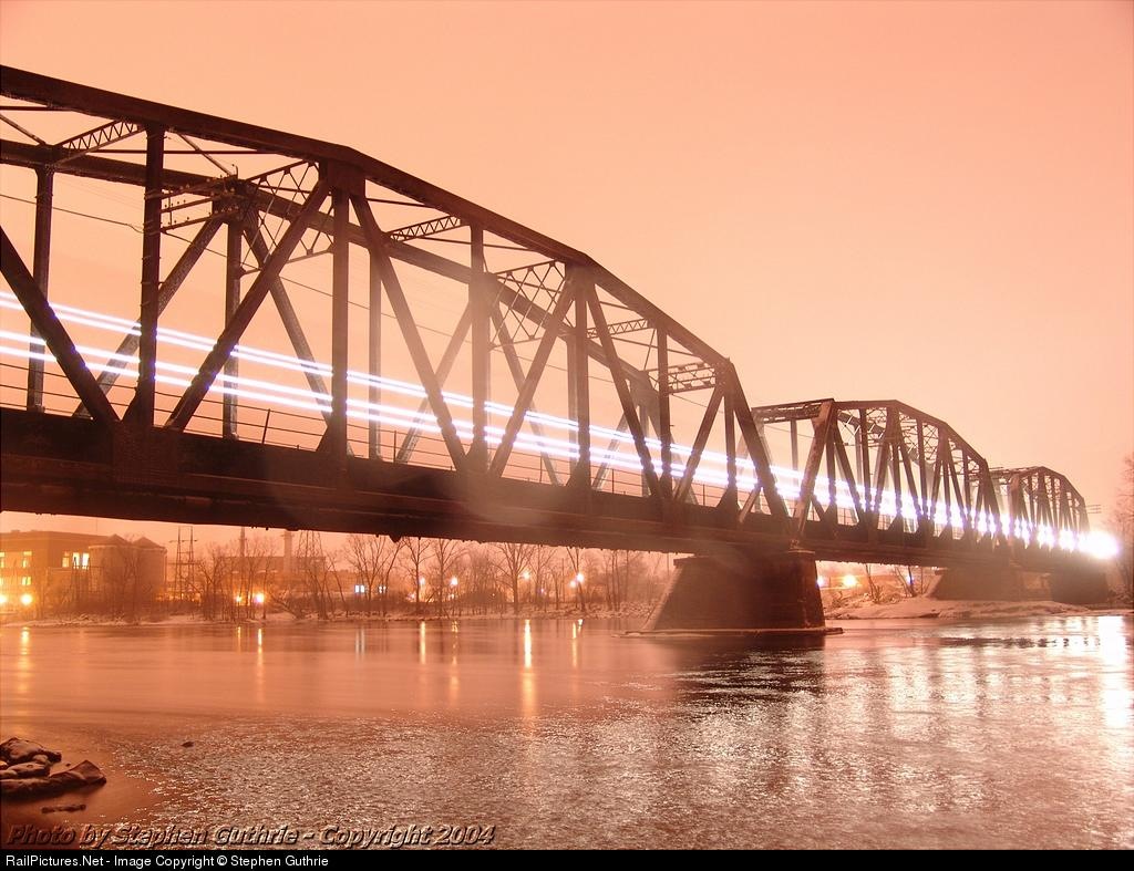 The headlight from E24961-04 and the City lights from Stevens Point have the snow storm lite up as it crosses the Wisconsin River Bridge.