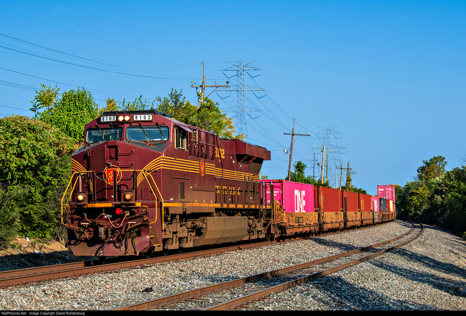 | Norfolk Southern's PRR Heritage Unit, NS 8102, leads intermodal train 263 down the former PRR rails of the NS New Castle District in Sharonville on a sunny Fall Sunday morning. |