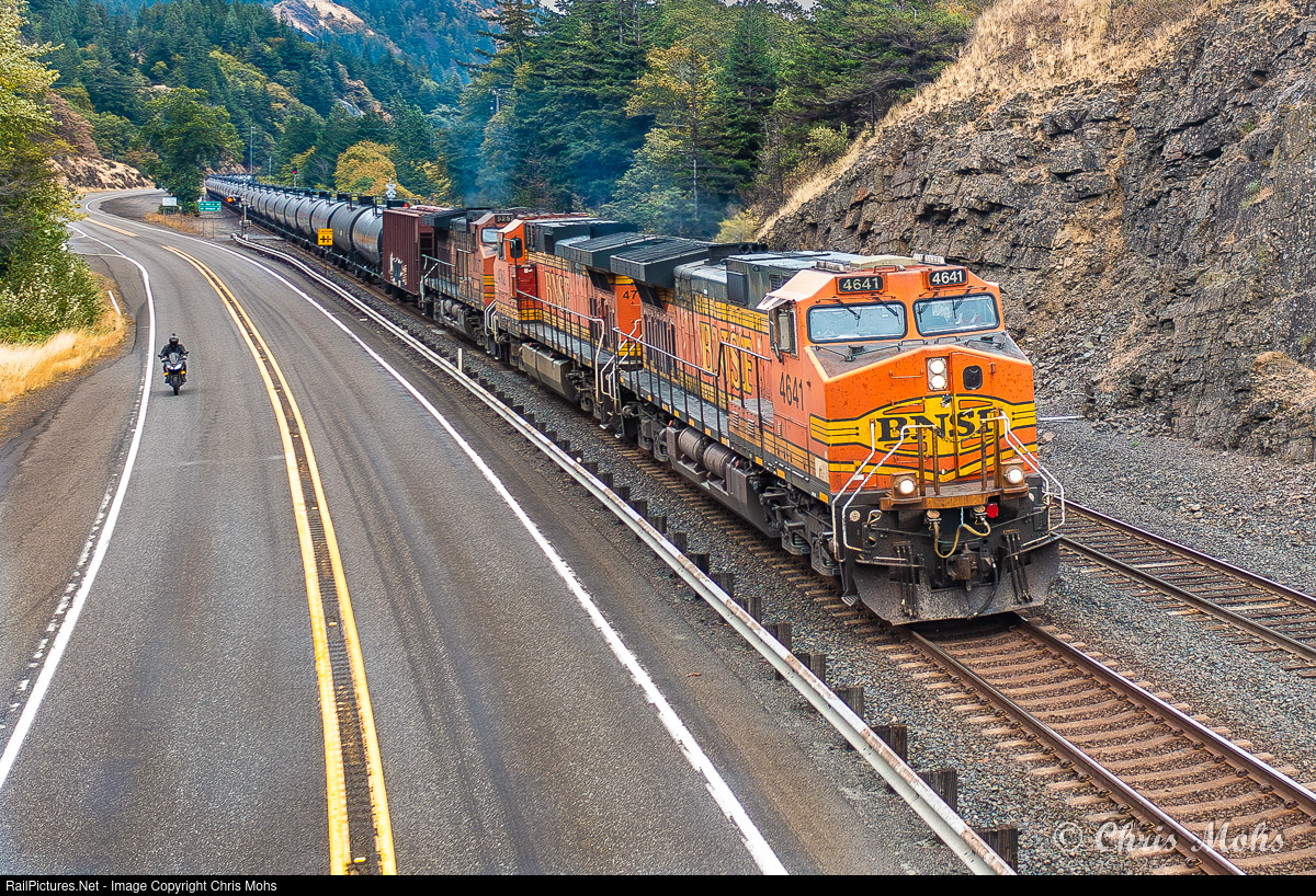 | Westbound BNSF C44-9W no. 4641 with a manifest of Crude oil for shipment overseas, races a Motorcyclist on Highway 14 past Dog Mountain parking lot on the Fallbridge Subdivision. |