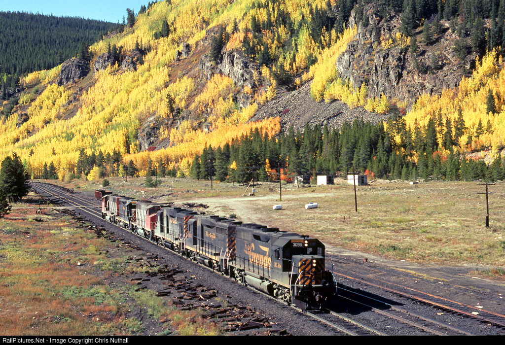 During the Aspen season, the Helper set makes its way through Pando, on its way back from Tennessee Pass to Minturn. The set includes two of the six CN GP40-2L locomotives, which were on test on the D&RGW for the then new Super Series wheelslip/slide creep control equipment for that September. The line up was 3098, 3022, 3021, CN9607, 3042 and CN9616.