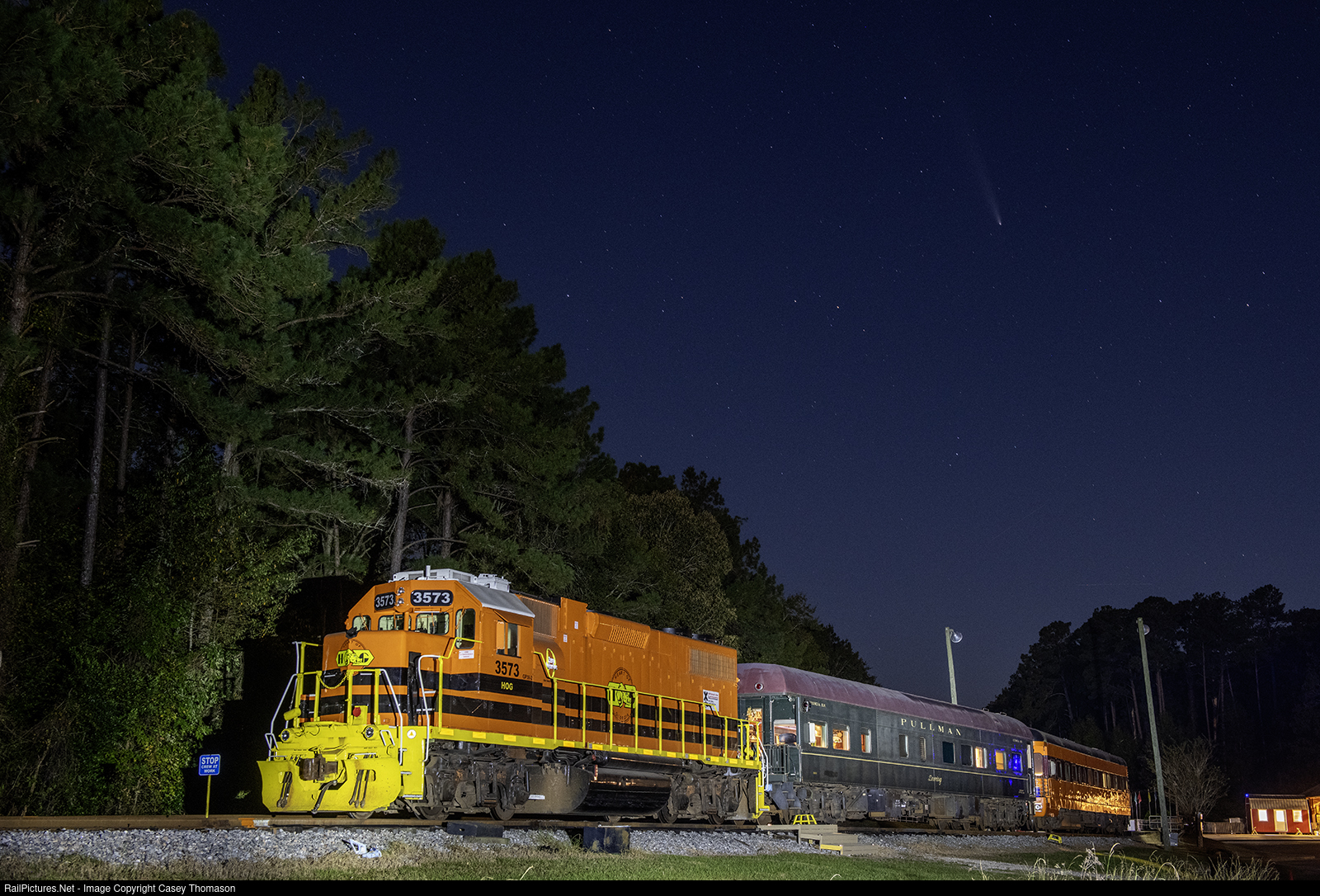 | The SAM Shortline excursion train rests overnight at Georgia Veterans State Park, ready for Saturday morning's excursion, while the sky features comet C/2023 Tsuchinshan-Atlas. |