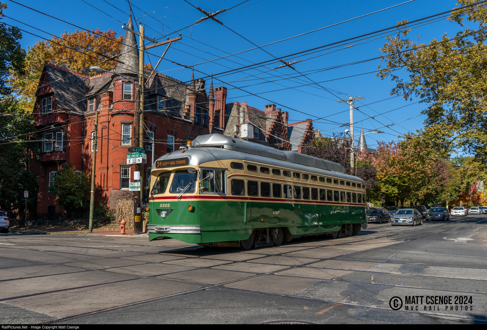 Southeastern Pennsylvania Transportation Authority (SEPTA) PCC III car 2322 is seen at Baltimore Ave and S 42nd St during a Friends of Philadelphia Trolleys charter on the subway-surface lines and diversion trackage.