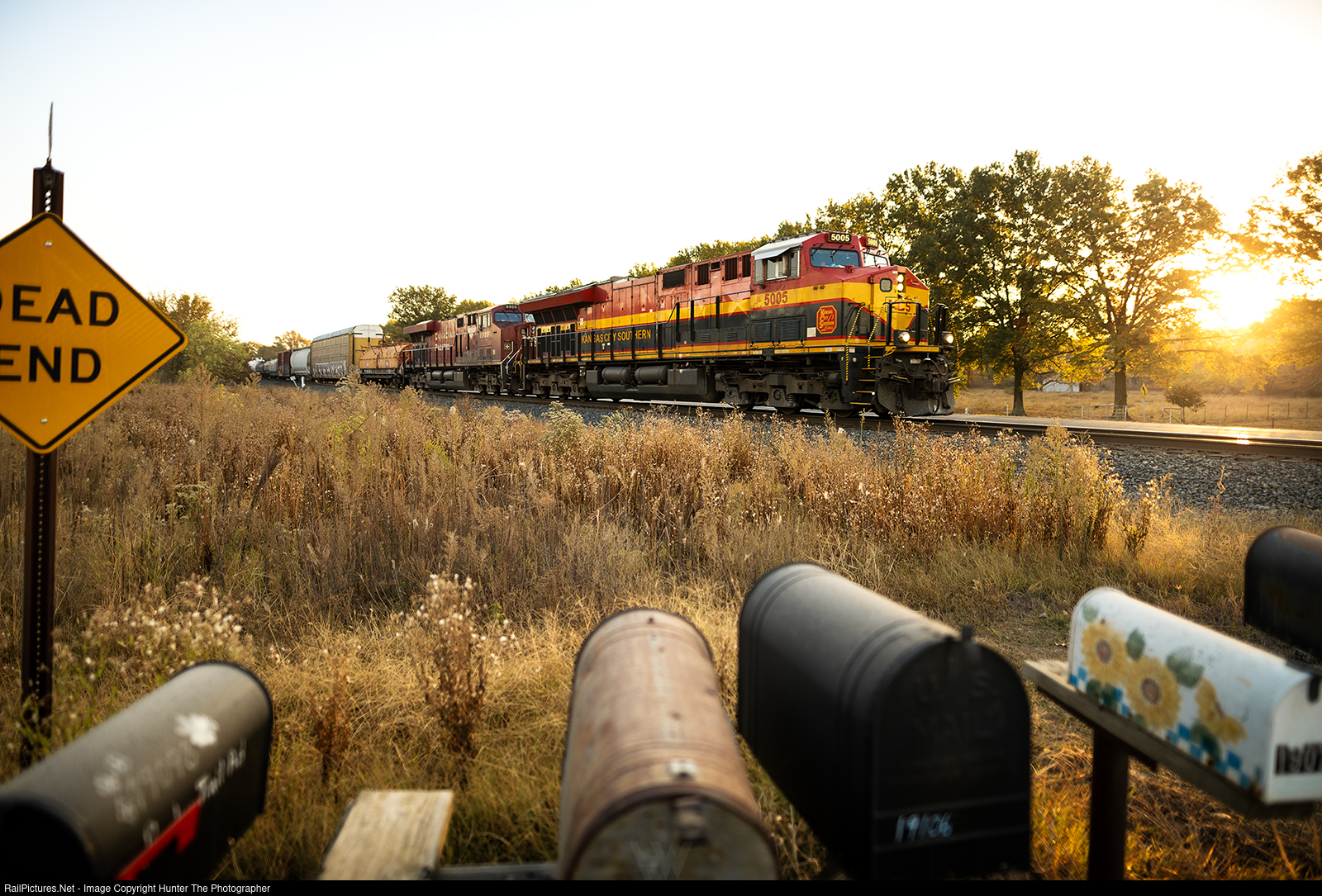Autumn Gold | With the brilliant golden sun rising behind the trees south of Decatur, AR on a warm Thursday, October 24, 2024 morning, a southbound CPKC train passes a row of mailboxes with a pair of GE motors doing the honors. Though running as intermodal train I180, a large portion of the train consisted of mixed freight cars.