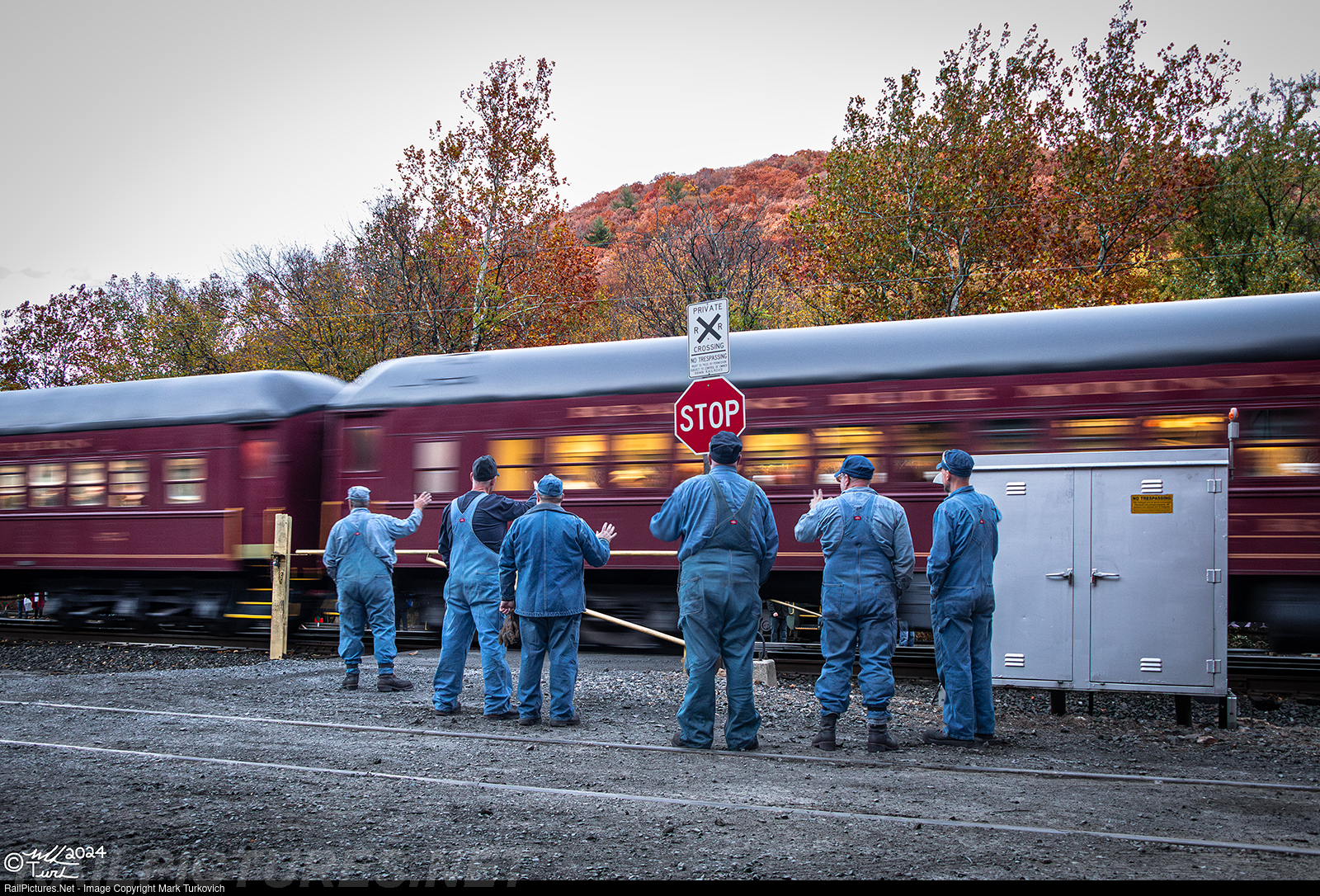 Reading 2102's crew of Shane Frederickson, Keith Strobel, Brian Messinger, Ian McKeown, Chuck Trusdell, and Ryan Bausher gives a friendly wave to the passengers onboard the train as 2102 departs Port Clinton after a stop for a crew change.