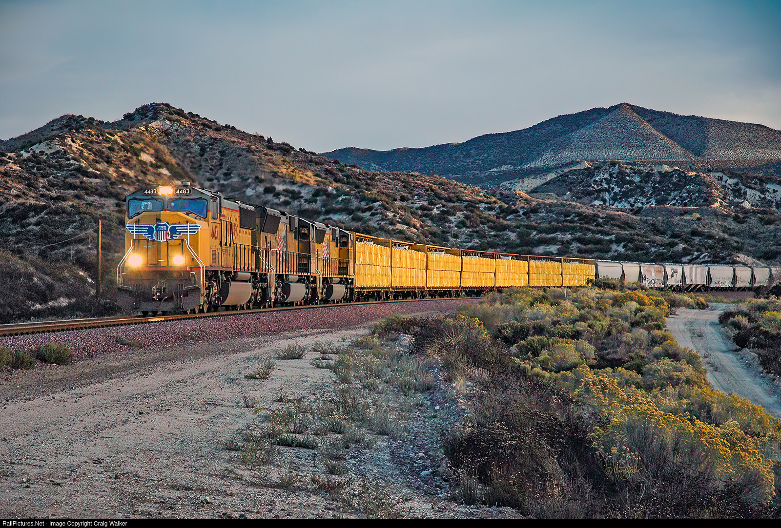 Union Pacific train MANWC 05, which originated in Arden, Nevada, and is heading for West Colton Yard in southern California. Three UP SD70Ms – 4483, 4968 and 3800 – are taking this train through Alray, in the heart of Cajon Pass at sunup. (Cajon Pass, California – November 6, 2010)