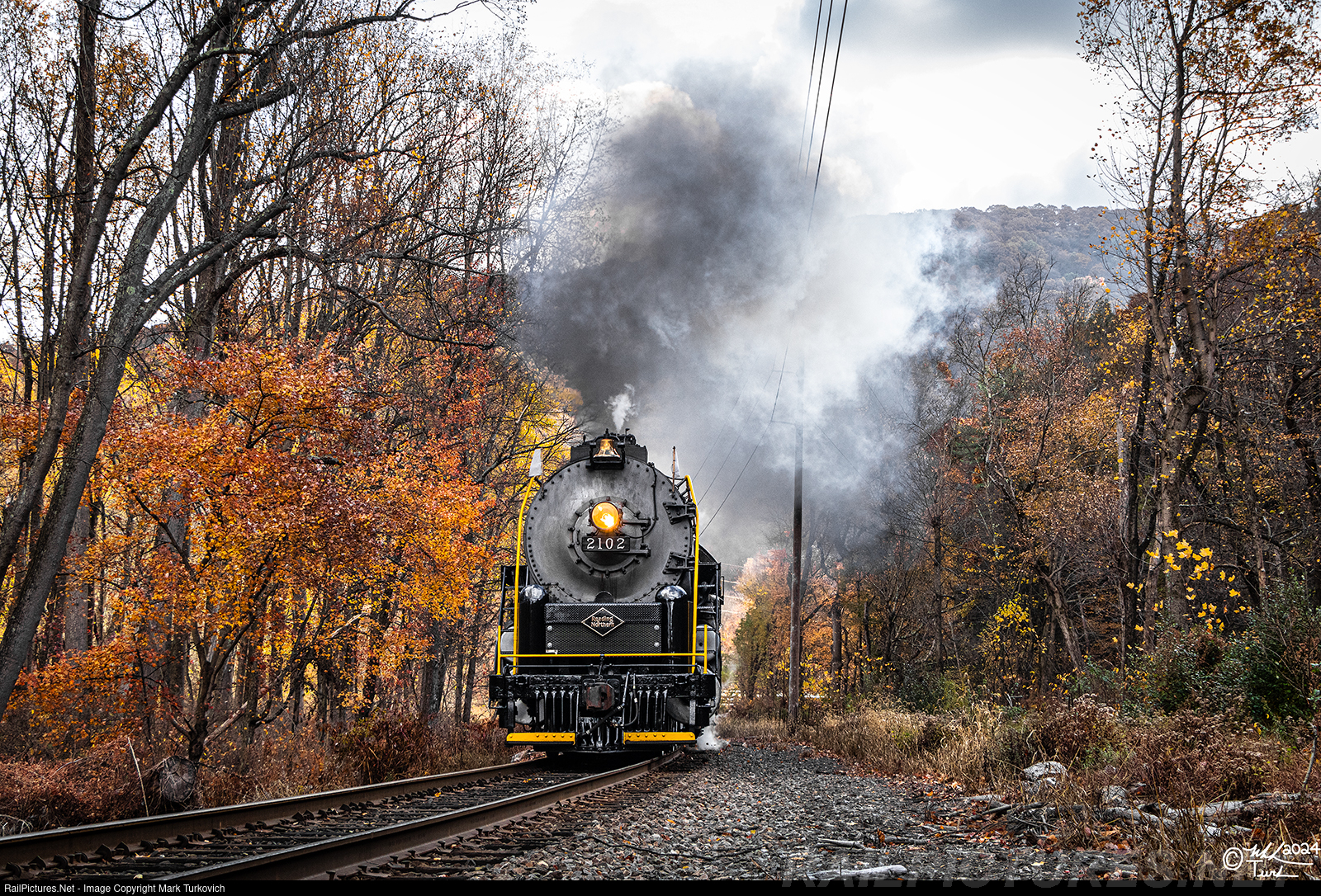Reading 2102 rounds Black Oak Curve with its passenger train on a cool fall morning.