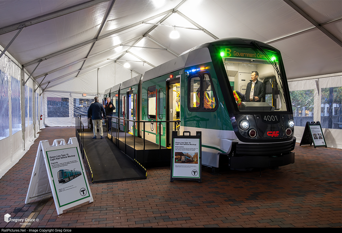 Between October 29 and 30, 2024, the Massachusetts Bay Transportation Authority (MBTA) displayed a full-size, half-length mockup of its new CAF-built Green Line "Type 10" light rail vehicles (LRVs) at City Hall Plaza in Boston’s Government Center. The Type 10s are a 100% low-floor design with seven articulated sections, featuring the latest accessibility technology, modern passenger information systems, and enhanced safety equipment. These new vehicles will replace the older Type 7 and Type 8 cars, with service expected to begin in 2027.