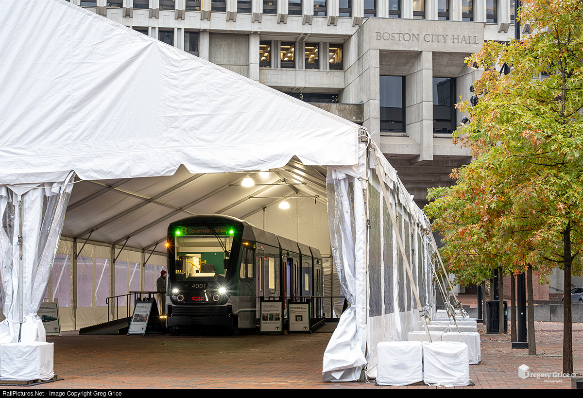 Between October 29 and 30, 2024, the Massachusetts Bay Transportation Authority (MBTA) displayed a full-size, half-length mockup of its new CAF-built Green Line "Type 10" light rail vehicles (LRVs) at City Hall Plaza in Boston’s Government Center. The Type 10s are a 100% low-floor design with seven articulated sections, featuring the latest accessibility technology, modern passenger information systems, and enhanced safety equipment. These new vehicles will replace the older Type 7 and Type 8 cars, with service expected to begin in 2027.