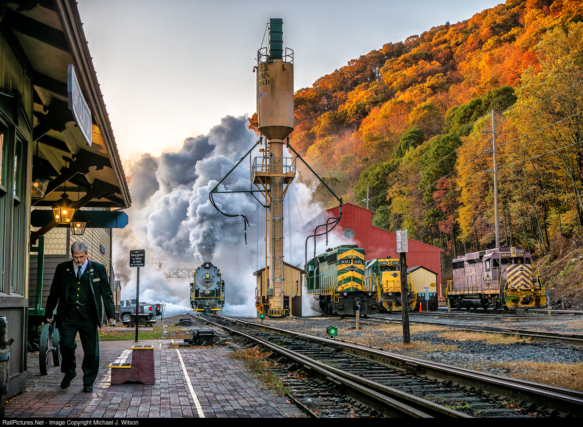 | "Fall Morning in Port Clinton": Early morning sun lights the mountain west of Port Clinton, PA on the morning of October 19, 2024 as the yard comes to life with the sounds and smells of railroading. A trainman walks to the R&N headquarter offices as T-1 #2102 warms her cylinders and heads south for the Outer Station in Reading for another day hauling a Fall Foliage Special on mostly the same track she was designed and built for almost 70 years ago. |