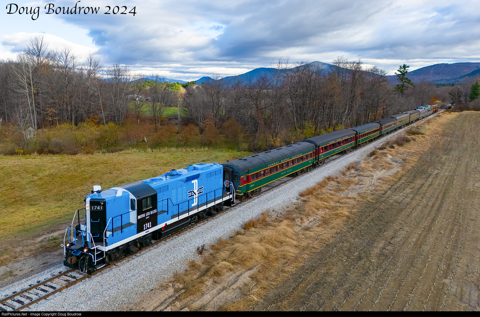Newly restored 470 Railroad Club Boston & Maine GP9 1741 is leading the 470 Club Excursion on the Conway Scenic Railroad's former B&M Conway Branch, home rails for this engine. Despite a forecast of full sun, big, dark clouds hung in for most of the morning. I really wanted this shot with full sun, but it was not meant to be. The 470 Club did a fantastic job restoring this engine and it is great to see a genuine Bluebird roaming the rails in 2024.