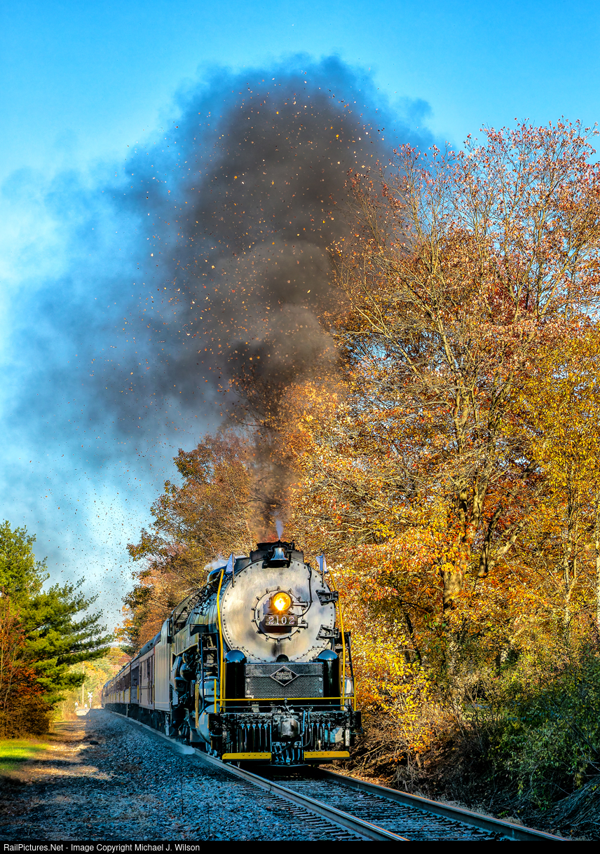 | With leaves flying Reading & Northern T-1 #2102 marches south towards Port Clinton on October 19, 2024 hauling a Fall Foliage Special. This trackage is former Central Railroad of New Jersey right of way which will eventually reconnect into the former Reading ROW at Haucks. |