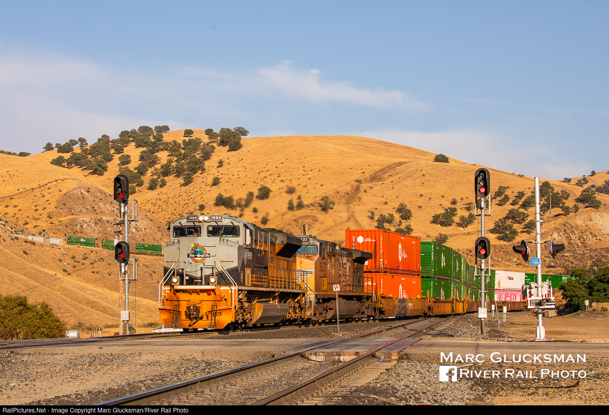 Beauty In Bealville. Union Pacific Railroad ZLCLT-21 (UPRR 1989, DRG&W heritage, SD70AH leading) was passing CP SP341 in Bealville, California on Tuesday, July 21, 2020 as it headed towards Bakersfield and beyond. This crossing, at Bealville Road, is at a portion of the railroad that levels out for a stretch as it gives up significant altitude after making the turns around Tehacahpi, demonstrated by the angle of the intermodal containers in the background. The legendary Denver, Rio Grande, and Western Railway merged with Union Pacific Railroad on September 11, 1996, and the UP honors its legacy with this engine.