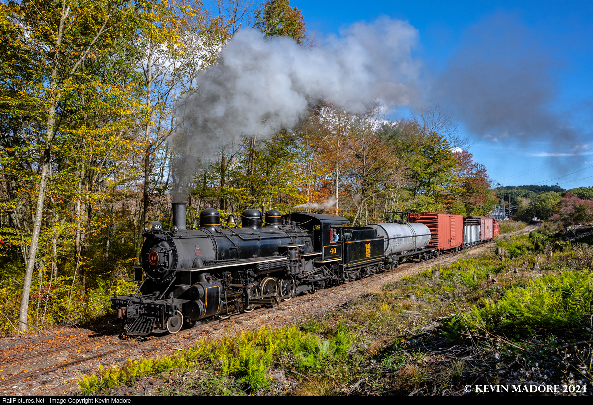 Freight on the Valley Line. The former Aberdeen & Rockfish Mikado #40 takes a short, branch-line freight north out of Old Saybrook, CT on the former New York, New Haven & Hartford Connecticut Valley Line, which is operated today by the Valley Railroad Co. of Essex, CT. The train pictured here was operating for an October 2024 photo shoot organized by Dak Dillon Photography and was probably the first steam photo freight that has been operated by the railroad since 2012. The cab crew this afternoon included Ken Blandina on the throttle and Casey Jane Palumbo firing. These folks did an amazing job making some smoke for us on the run-bys here, as the coal used on this line is a grade purchased specifically because it burns cleanly, almost like anthracite.