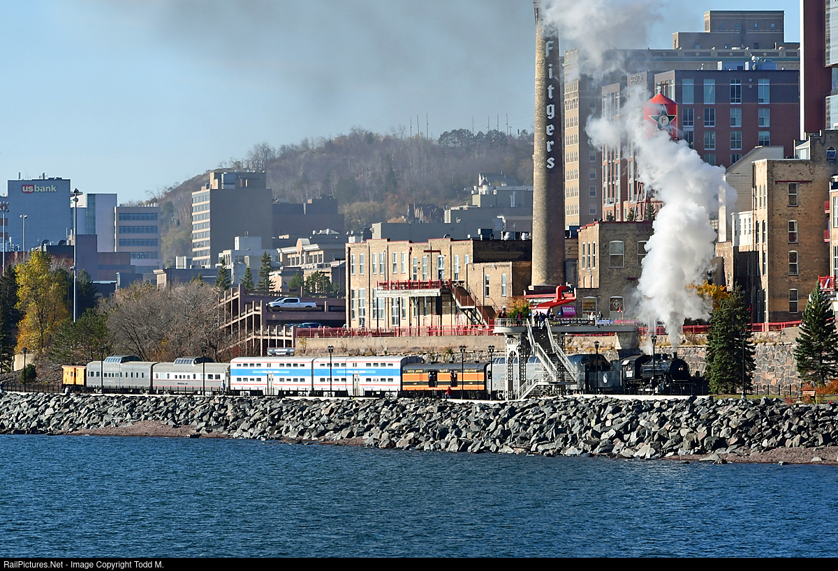 The fall steam excursion run from the Duluth Depot to Palmers siding featuring DMIR 332 rolls on the Lakefront line under the Fitgers Brewery complex on the shore of Lake Superior.