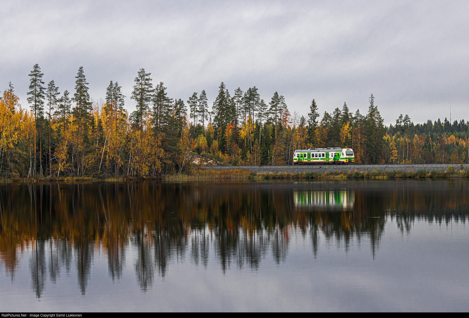 | Autumn has brought beautiful colours in the scenes of Haapamäki where a type Dm12 diesel railbus is speeding from Haapamäki to Keuruu, which continues all the way to Jyväskylä. At the moment, the lonely railbus is spreading its echoing sounds on the beautiful Tyrisevä lakebank. |