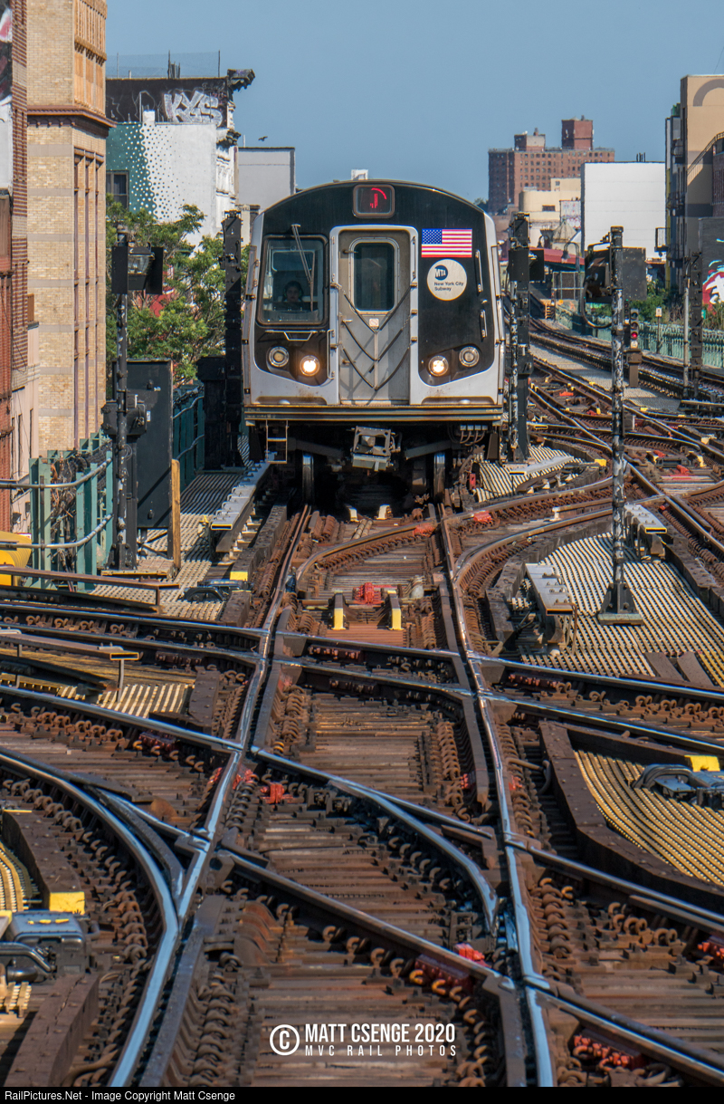 A Manhattan-bound New York City Transit Authority (NYCTA) J train is seen approaching Myrtle Avenue Station, crossing the numerous switches, frogs, and diamonds at the junction of the Jamaica and Myrtle Avenue Lines. In the foreground is a single slip switch, which along with double slip switches are uncommon in the system, and a diamond crossing, which are downright rare on the main lines of the subway!