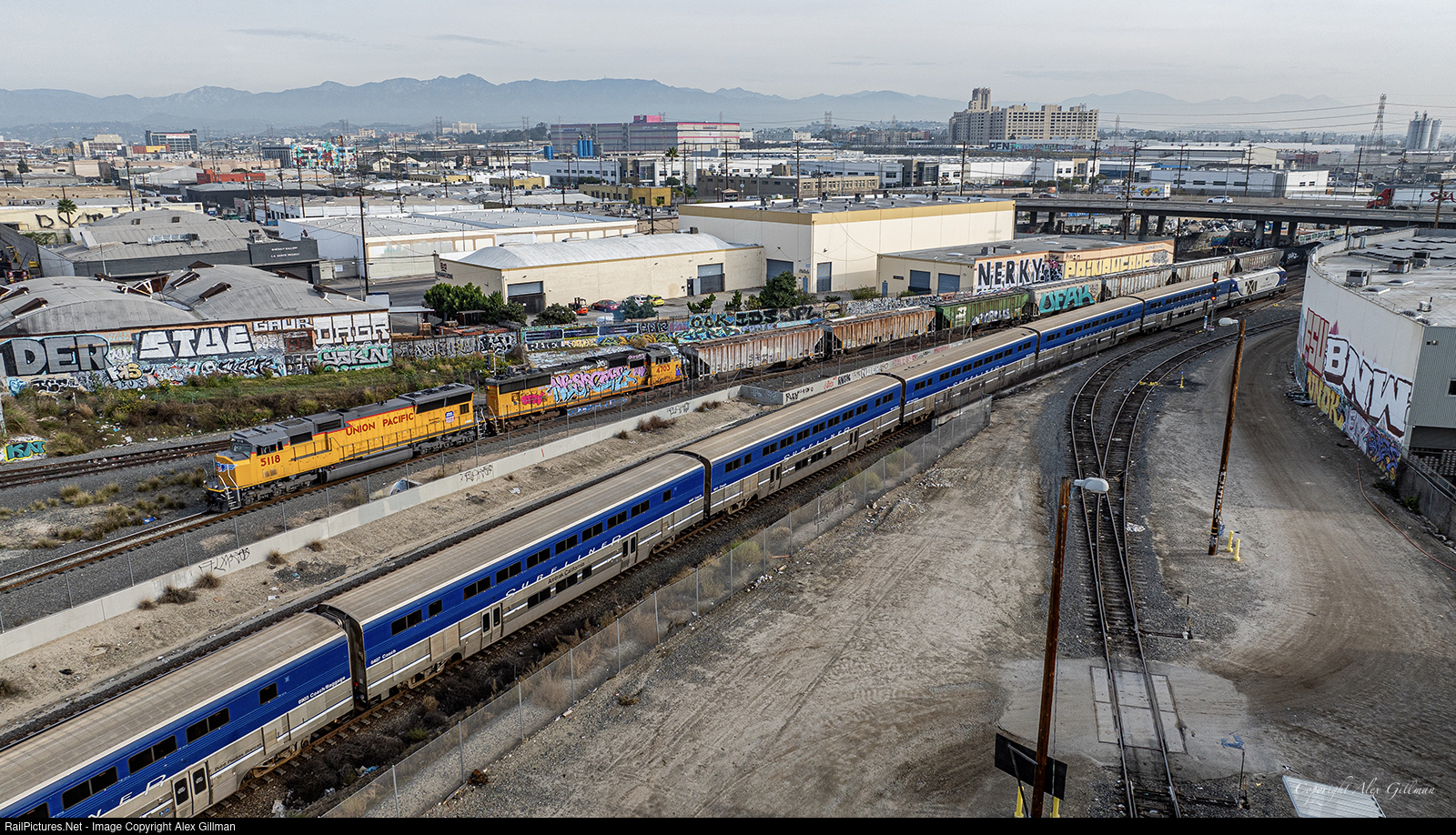 UP 5118, looking sharp in fresh paint, leads a westbound local off the ACTA Alameda Corridor Subdivision and onto one of the outside leads adjacent to the Alameda Corridor as an Amtrak Pacific Surfliner sits at the entrance to the trench. Wait...that's not right, is it? You read that right - for four (4) days in December of 2023, Metrolink shut down all operations - mainly due to station work in and around Los Angeles Union Station. Since a majority of the work took place on the west bank of the Los Angeles River near Mission Tower, the Los Angeles-San Diego-San Luis Obispo (LOSSAN) agency in charge of Pacific Surfliner operations opted to continue operating Surfliners by having them bypass LA Union Station. This was accomplished by using tracks on the east bank of the LA River, which are generally used by Metrolink and Union Pacific trains and not Amtrak. As such, when northbound Amtrak trains from San Diego came into Vernon, they would travel on BNSF tracks that merged into the ACTA Alameda Corridor Subdivision at the mouth of "The Trench." From there, crews would switch ends and then take the train back east to cross the river again before banking north along the river to continue their journey.