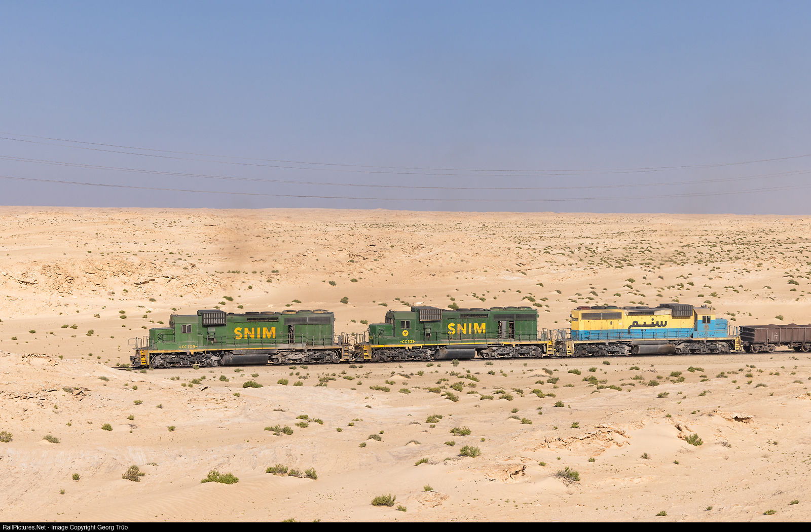 Loaded ore train M4 from Zouérate/F'derîk to the port of Nouadhibou only minutes from destination, pulled by a SDL40-2 consist of CC # 109, # 103 and # 117. The locomotives # 101 to # 110, built in 1981/1988, are in green paint scheme like they were delivered.