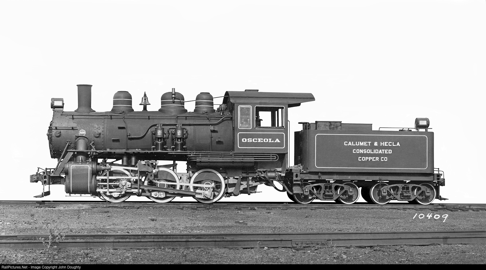 Calumet & Hecla Mining Company 0-6-0 "Osceola" had a total engine and tender weight of 222,500 lbs., and a tractive force of 34,400 lbs. It was built by the Baldwin Locomotive Works, where my great, great uncle, Robert F. McKee, Sr., was a design engineer. This Baldwin Locomotive Works builders photo card is from the John R. Doughty collection.