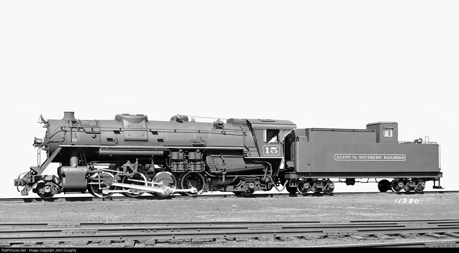 My great, great uncle Robert F. McKee, Sr., was a design engineer at Baldwin and he would give my father different Baldwin Locomotive Works builder's cards when my father would visit him in Collingswood, New Jersey. This 2-8-2 steam locomotive, number 15, was built for the Alton & Southern Railroad. According to the specifications listed on the back of the builder's card this engine had a total weight of 579,400 lbs., and a tractive force of 64,300 lbs. This Baldwin Locomotive Works builders photo card is from the John R. Doughty collection.