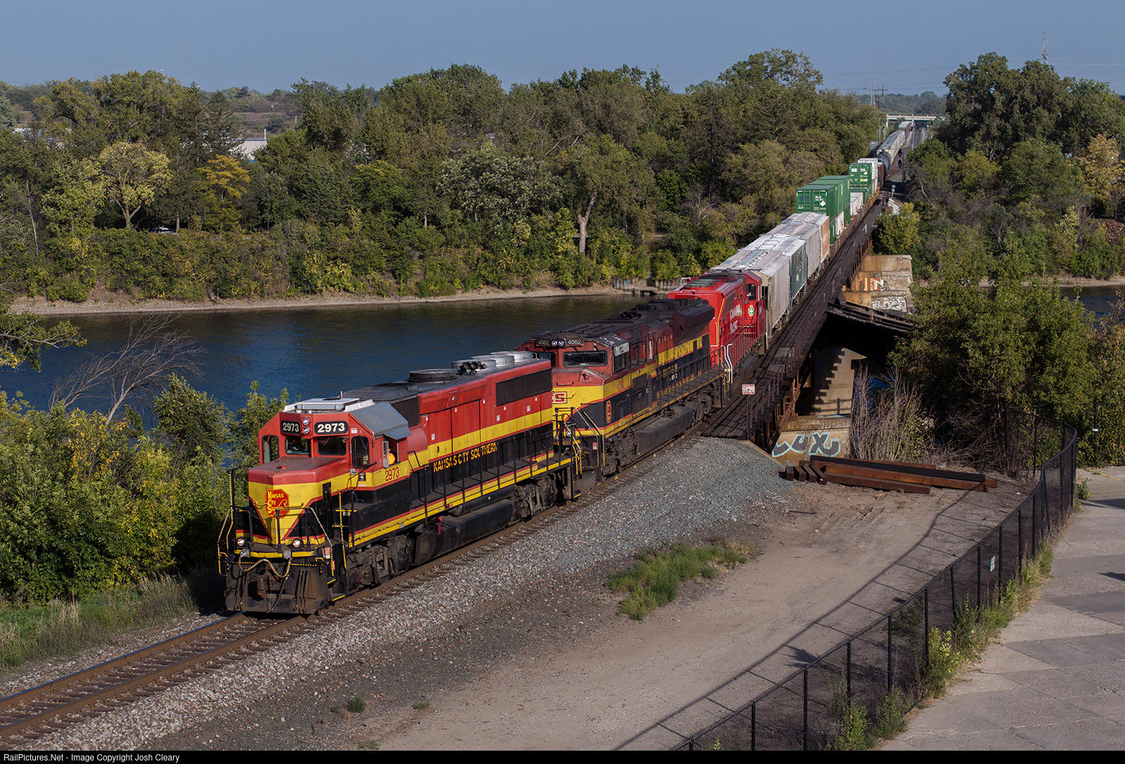 A KCS GP40-3 leads J42 over the Mississippi River at Camden.