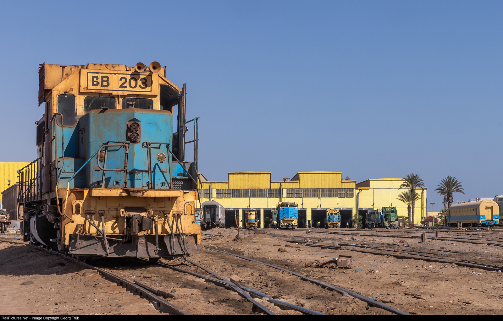 In front of the SNIM workshop in Nouadhibou we can see american built diesel power from left to right: GPL-15T BB # 203, BB # 201, SD70ACS CC # 124, GPL-15T BB # 207, SDL40-2 CC # 110.