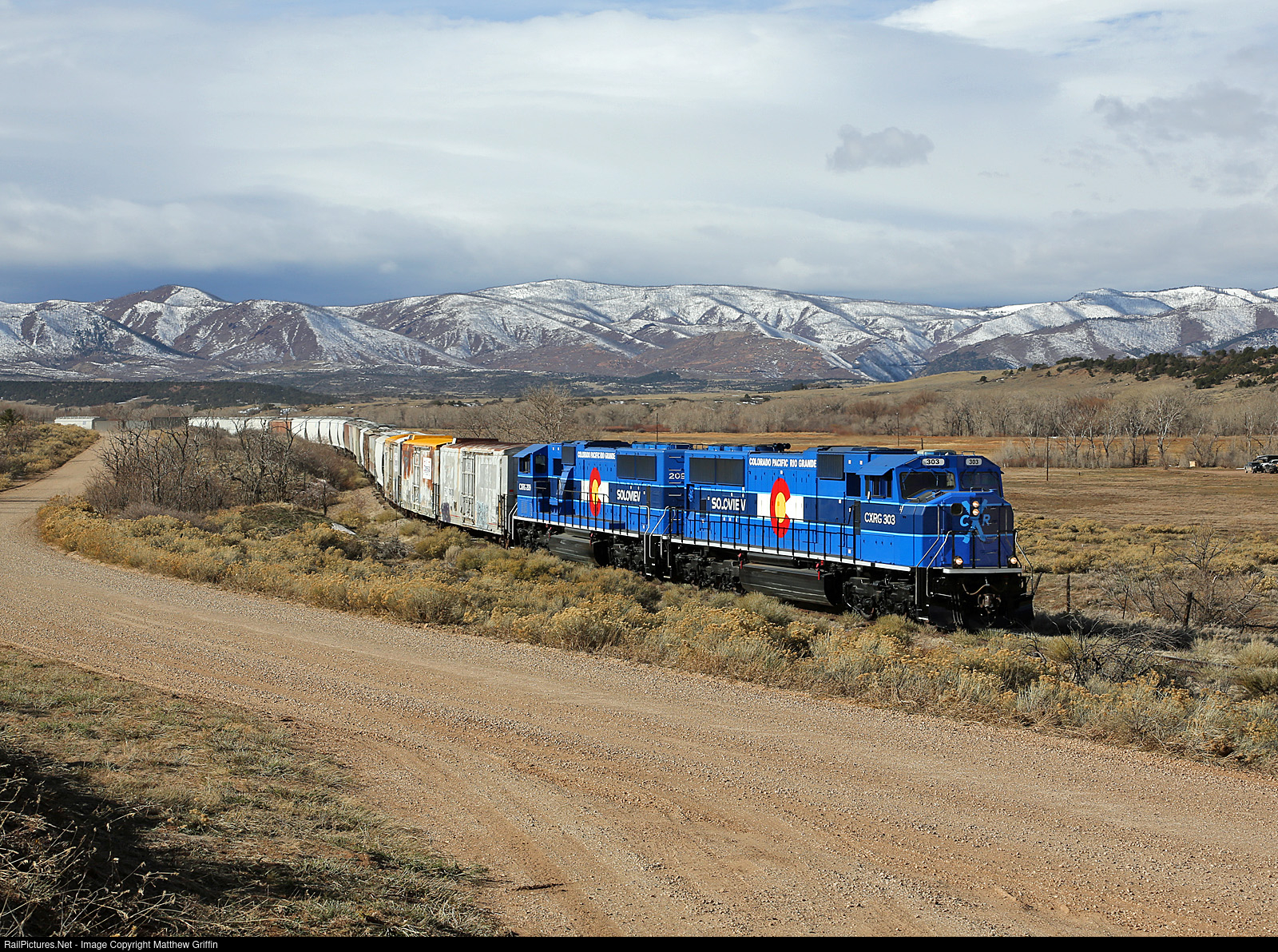 | Just east of the small town of La Veta, CXRG 303 leads the eastbound Alamosa to Walsenburg turn on a cold, windy late morning. |
