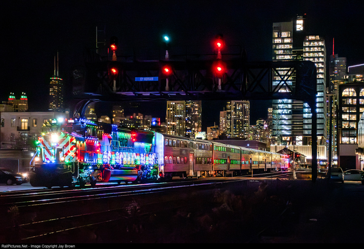 Bringing Christmas to the suburbs, Metras RTA themed SD70MACH is decked out with Christmas lights, as its seen here racing through Morgan… leaving behind a cold, yet busy, downtown Chicago skyline.