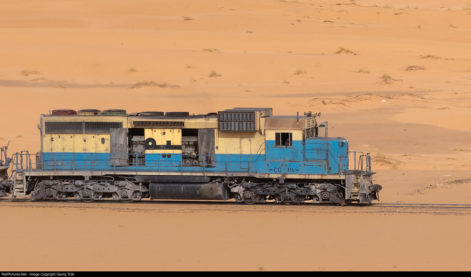 | Roster shot of the SDL40-2 CC # 114 of the SNIM, pulling an empty ore train near Ben Amira. This locomotive was built in a third batch of 6 locomitives (# 111 to 116) in 1993 by EMD in Ontario/Canada. First 10 delivered SDL40-2 are in a green/yellow paint scheme. Last 11 loocmotives built in 1993 and 1997 are in the newer lightblue/yellow paint. Each locomotive has arabic lettering on the right and standard lettering on the left side. |