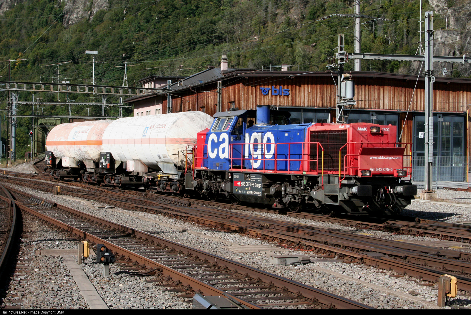| SBB Cargo 843 079 leads a short freight train through the station in Brig on a beautiful sunny morning in Switzerland. |
