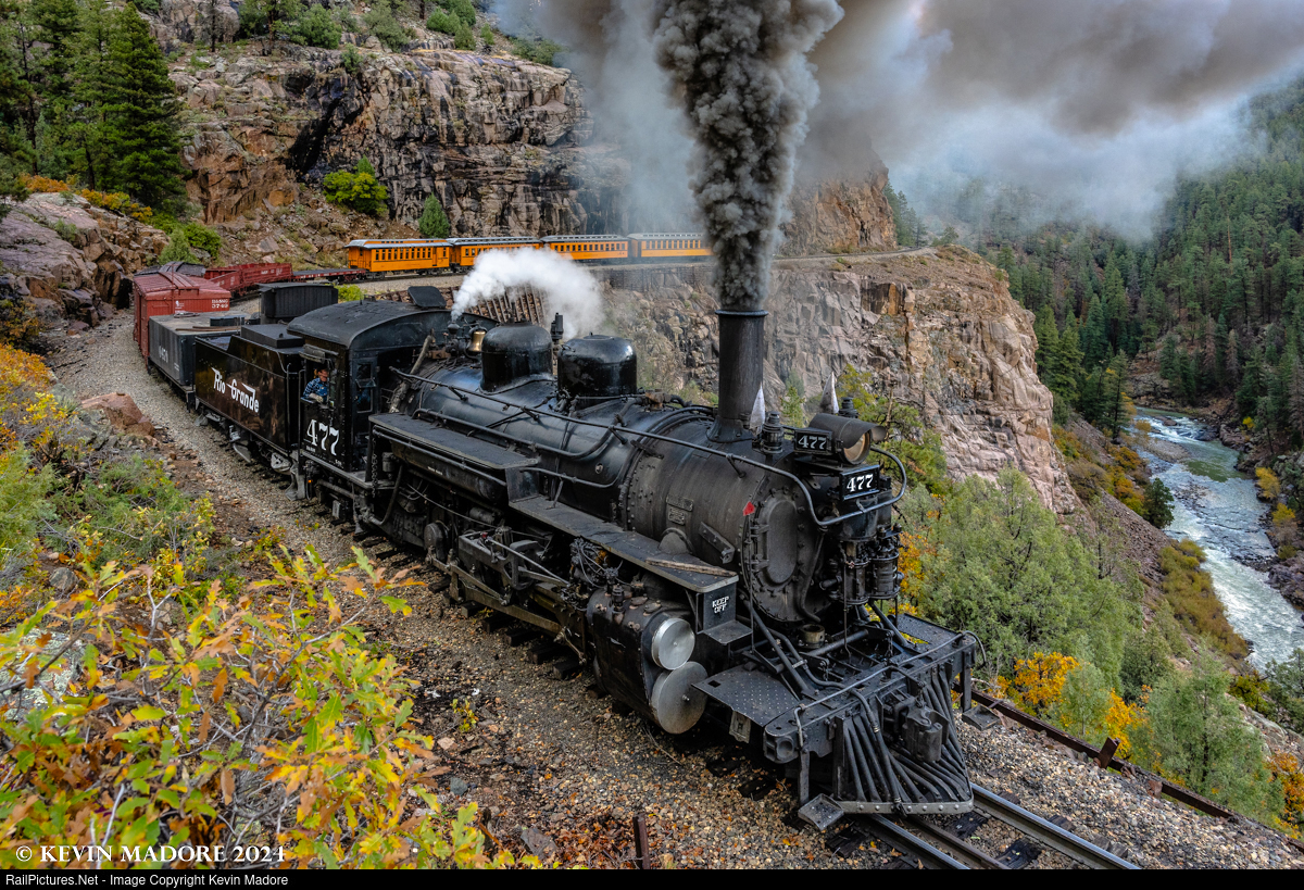 This image was captured during an October 2024 photo shoot on Colorado's Durango & Silverton Narrow Gauge Railroad, which featured K-28 Locomotive #473, re-lettered as one of her long-lost sisters, the #477. The original 477 was scrapped after hard wartime service in Alaska in the 1940s. Although the crew is making a dark exhaust plume for the cameras, the locomotive is actually loafing here, as the speed limit is only 5 mph, for obvious reasons. A derailment here would have serious consequences. In fact, there is guard rail installed along most of the horseshoe, as can be seen just in front of the cow-catcher pilot. This is one of the few photos that I have taken since the railroad converted to oil-firing, in which the lack of a coal bunker is really pretty obvious.