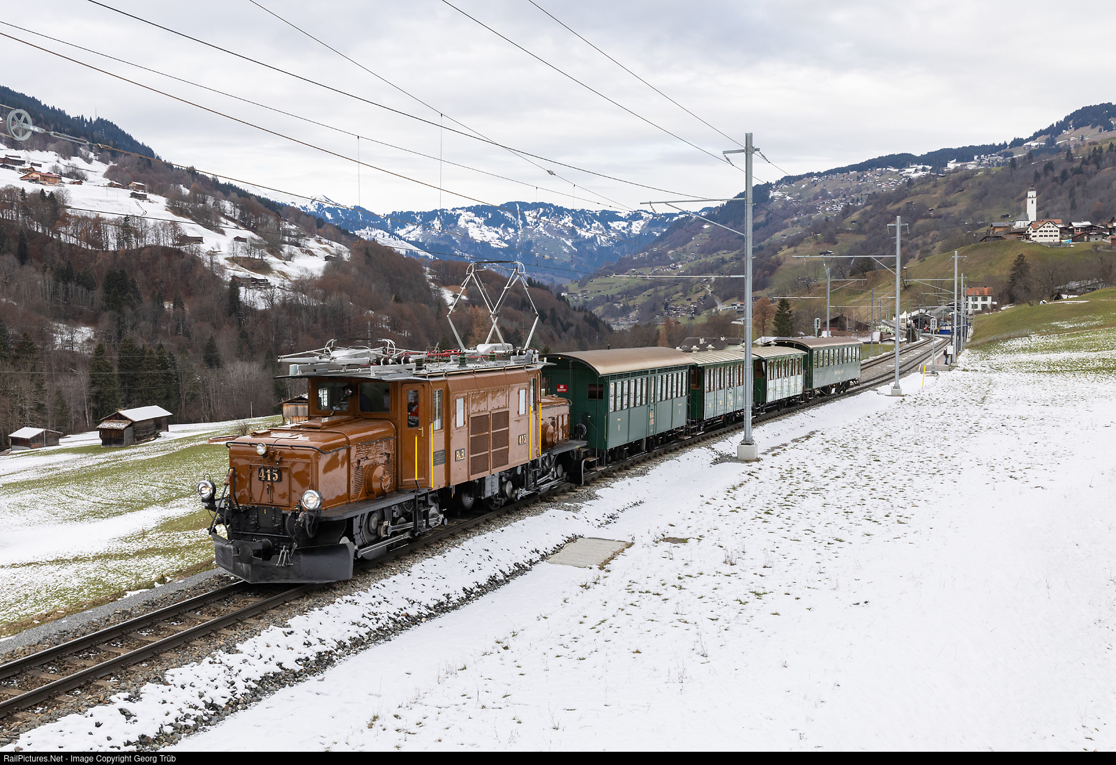 | "C-C" or "Rhaetian Crocodile" Ge 6/6 I # 415 of the Rhaetian Railway with train 92025 from Landquart to Klosters Platz in Saas im Prättigau. The train circulated to celebrete several renovations of stations on this line. |
