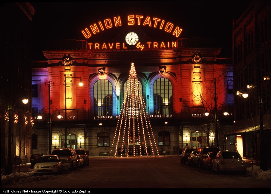17th Street and Wynkoop Street side of Denver Union Station is lite for the 2004 Holiday Season. The clock shows 7:00 PM, but wasn't working since it was around 11:00 PM. This Denver landmark continues to improve under RTD ownership.