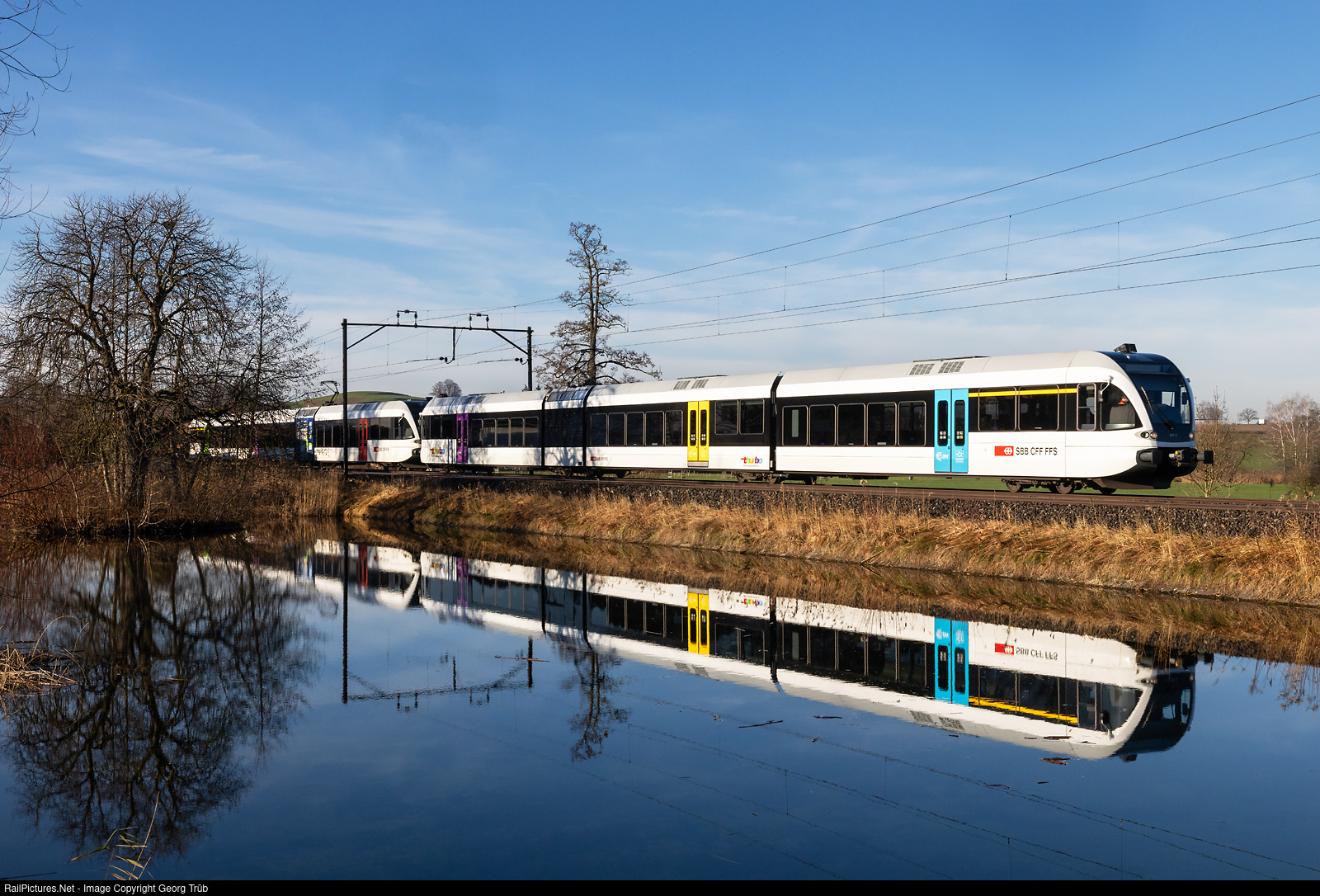 | Test train 97123 from Sulgen to Romanshorn Seewiesen at the pond near Erlen. The two articulated railcars RABe 526 # 767 and # 798 of Thurbo in multiple control were traveling back and forth all day, no idea what was being tested here. |