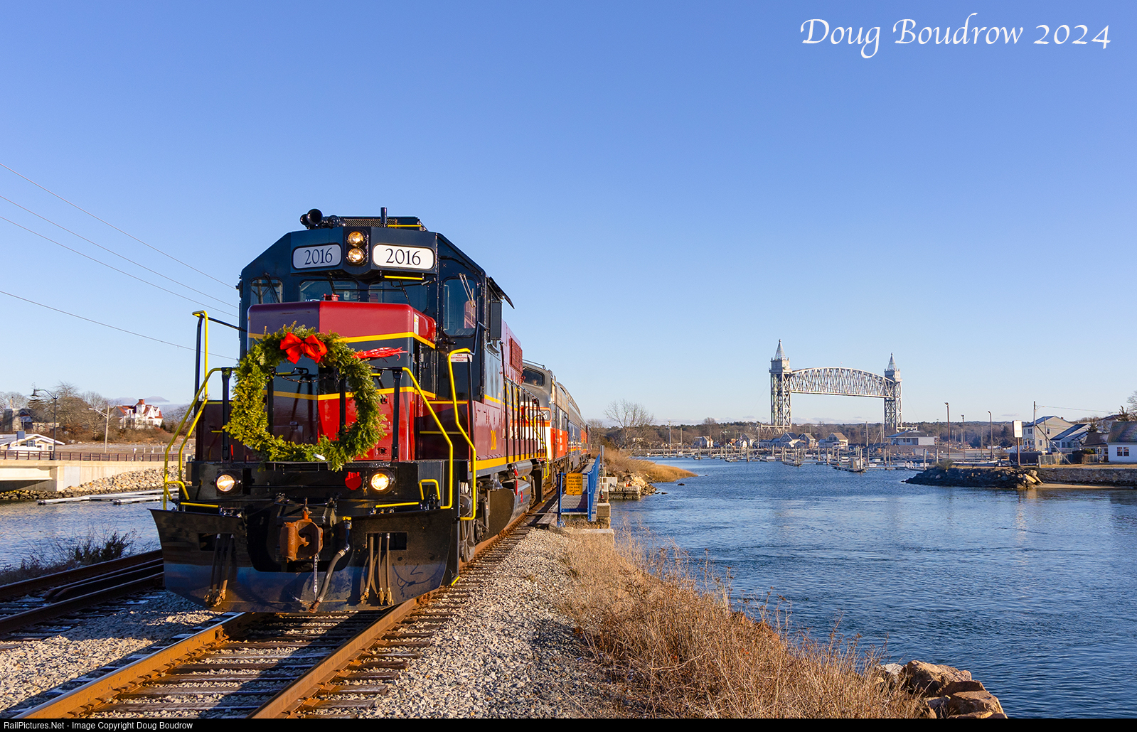The sold-out 2 pm Polar Express train is seen departing Buzzards Bay and crossing Cohasset Narrows. Cape Cod Central runs these popular trains every year selling out almost every trip.