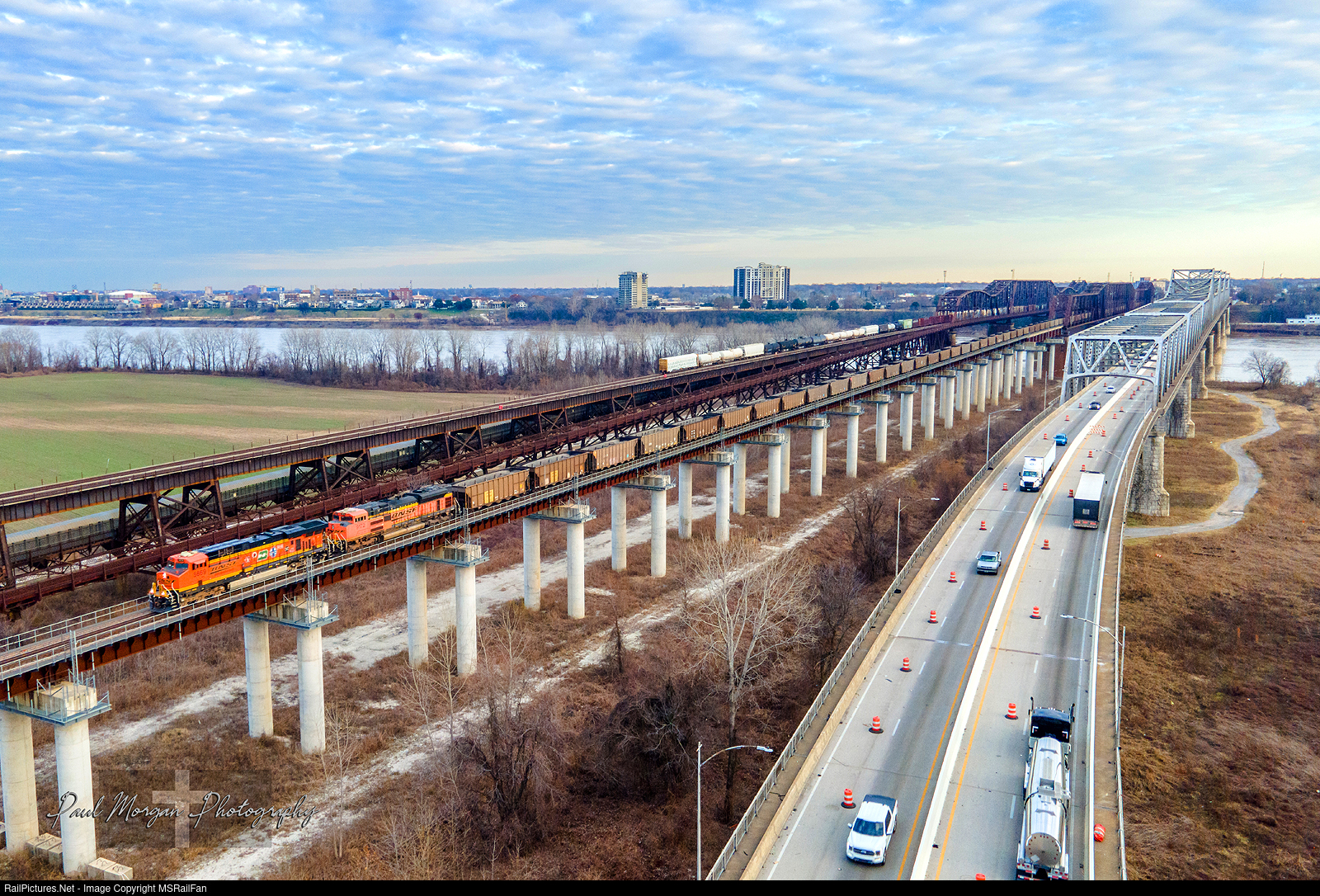 NS 733 becomes BNSF E-MHSCAM as it comes across the Mississippi River having transferred to the BNSF from the NS heading to Caballo Mine, WY from Juliette, GA. It had one of the sticker units leading, my third to catch.