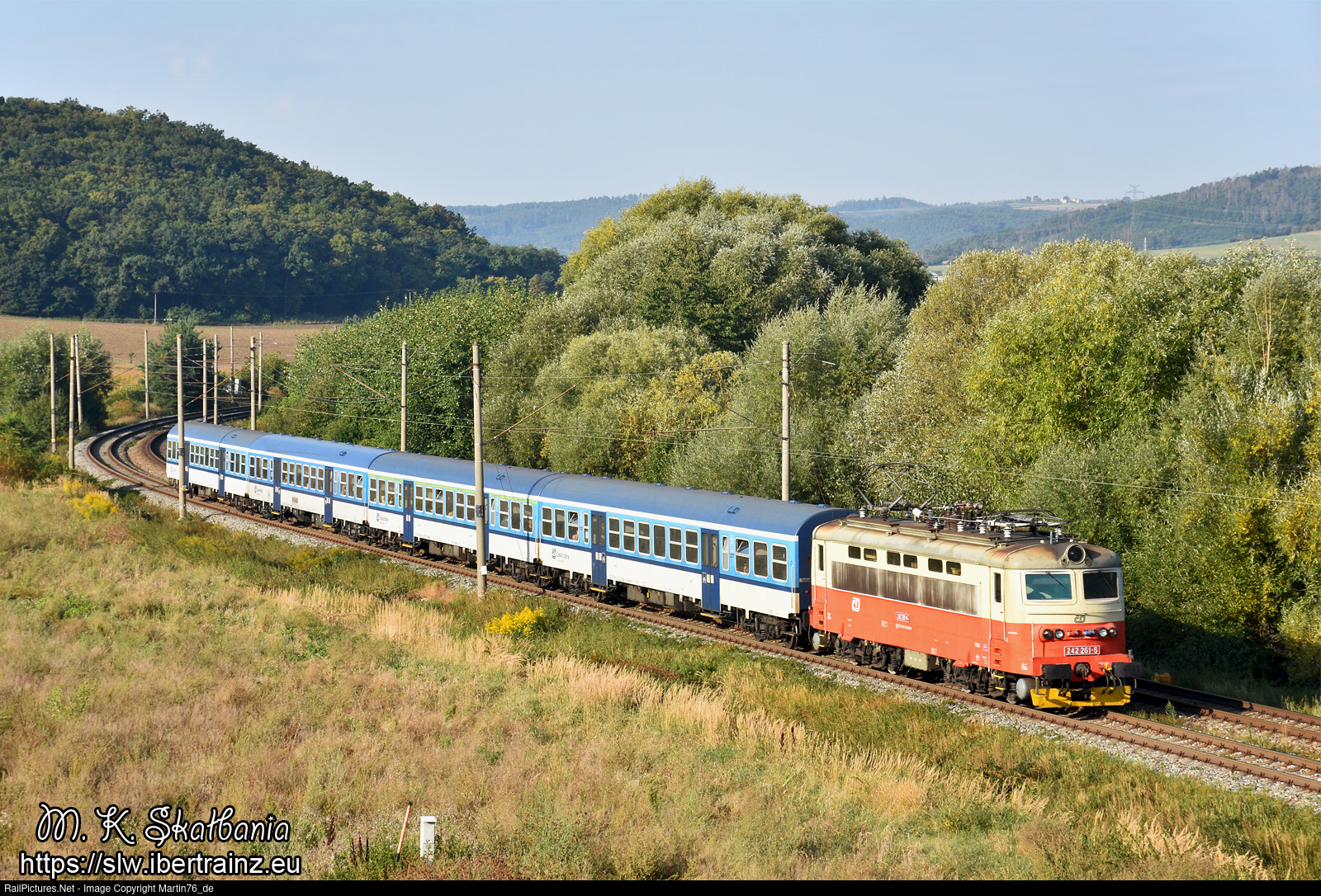 The electric locomotive 242.261-5 hauling a passenger train from Zdar nad Sazavu to Brno hl. n.