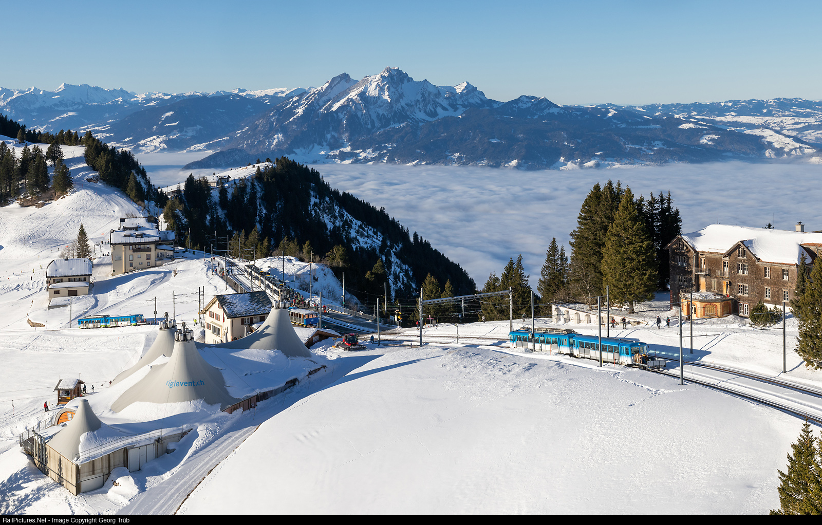 Perfect conditions on the Rigi, Queen of the mountains, with sun, snow and blue sky. It is now 09.44 AM and we can see 4 trains of the Rigi Bahnen in this overview to Rigi Staffel and the Pilatus mountain. In the foreground, first train 121 from Arth Goldau with cogwheel railcar BDhe 2/4 # 14, cab car Bt # 24 and small freight car Kk # 63 for sledges and skis left the station. In the station is the "sport train shuttle" with BDhe 4/4 # 15, cab car Bt # 25 and car B # 34. From left coming from Arth Goldau is second train 121 with BDhe 2/4 # 11, cab car Bt # 21 and freight car Kk # 65. From Vitznau coming, standing in the station at the platform, is train 1109 with articulated cogwheel trains Bhe 4/6 # 42 and # 41 in multiple control.