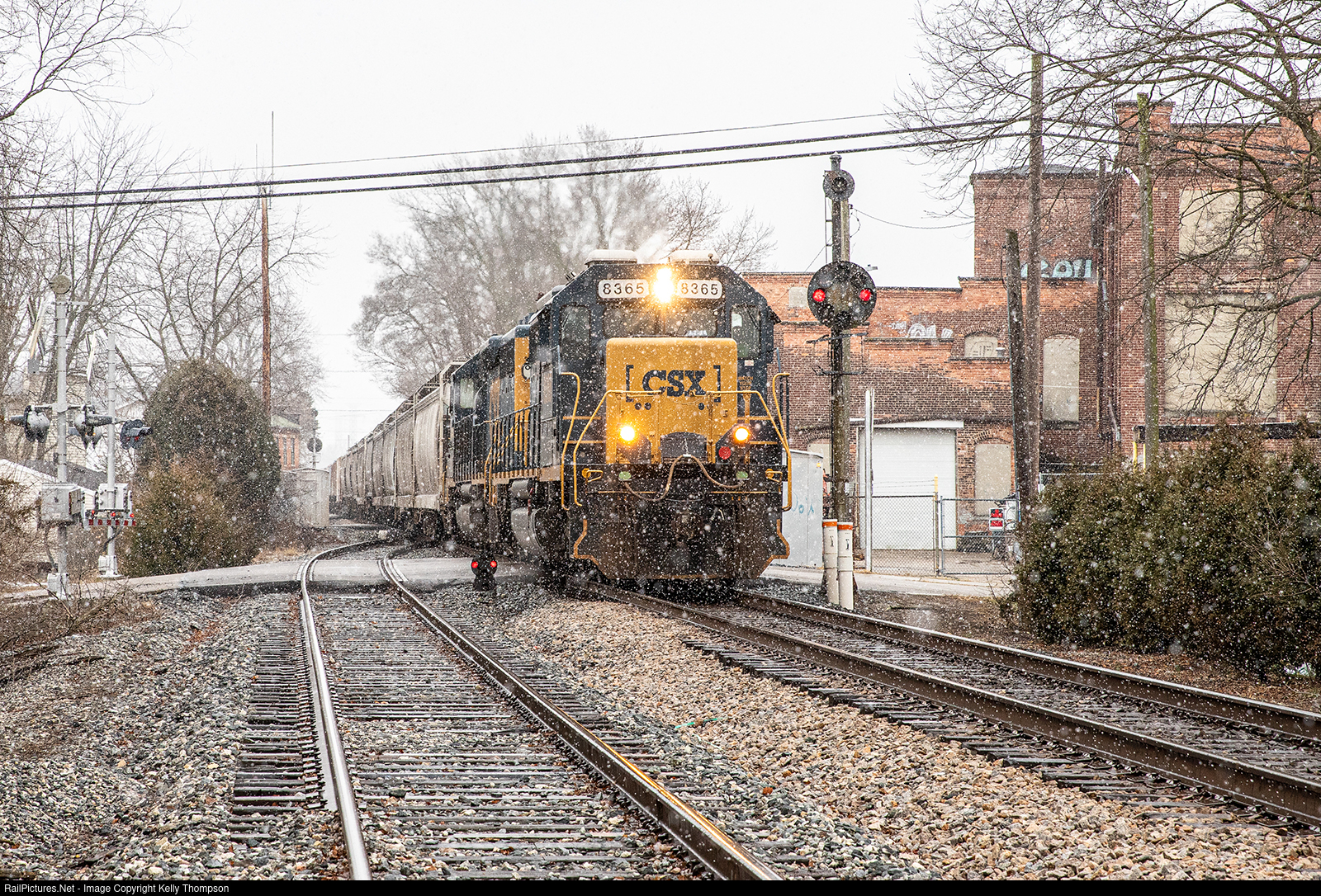 Snow is hitting central Ohio but the action is enough to get the railfans out! CSXT 8365 leads south past the former B&O CPL in Tipp City on its way to Queensgate.