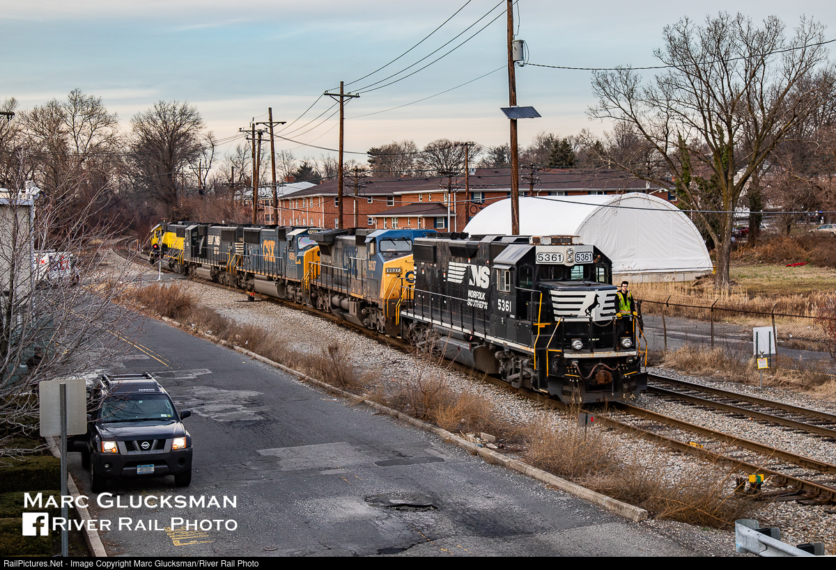 Crossing At Cross Street. New York, Susquehanna, and Western Railway's SU-99 was getting ready to go to Binghamton, New York on the late afternoon of January 2, 2019 when Norfolk Southern 5361 (née-CR 8223, EMD, GP38-2, 8/1978) was leading back from the Cross Street in Bogota, New Jersey. The geep would be nose in to the cars for the trip, with the power consisting five different types of locomotives from three different railroads.