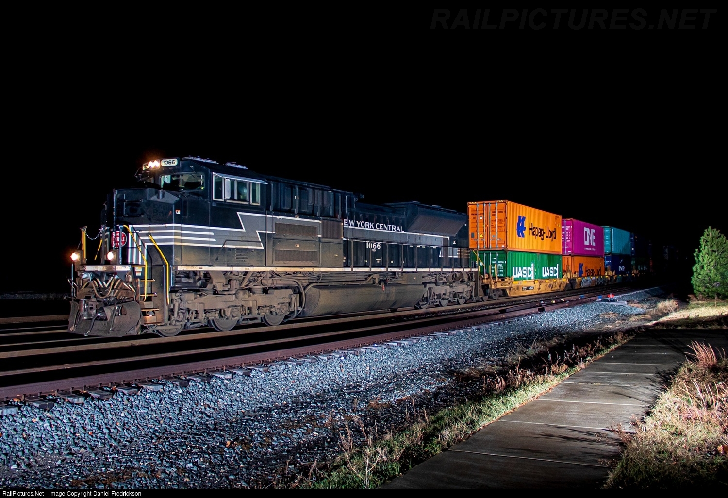 NS 1066, Norfolk Southern's "New York Central" heritage unit, plies former NYC rails as it guides NS stack train 277 for Landers Yard past the now-closed Mascot Hall of Fame in Whiting, IN.