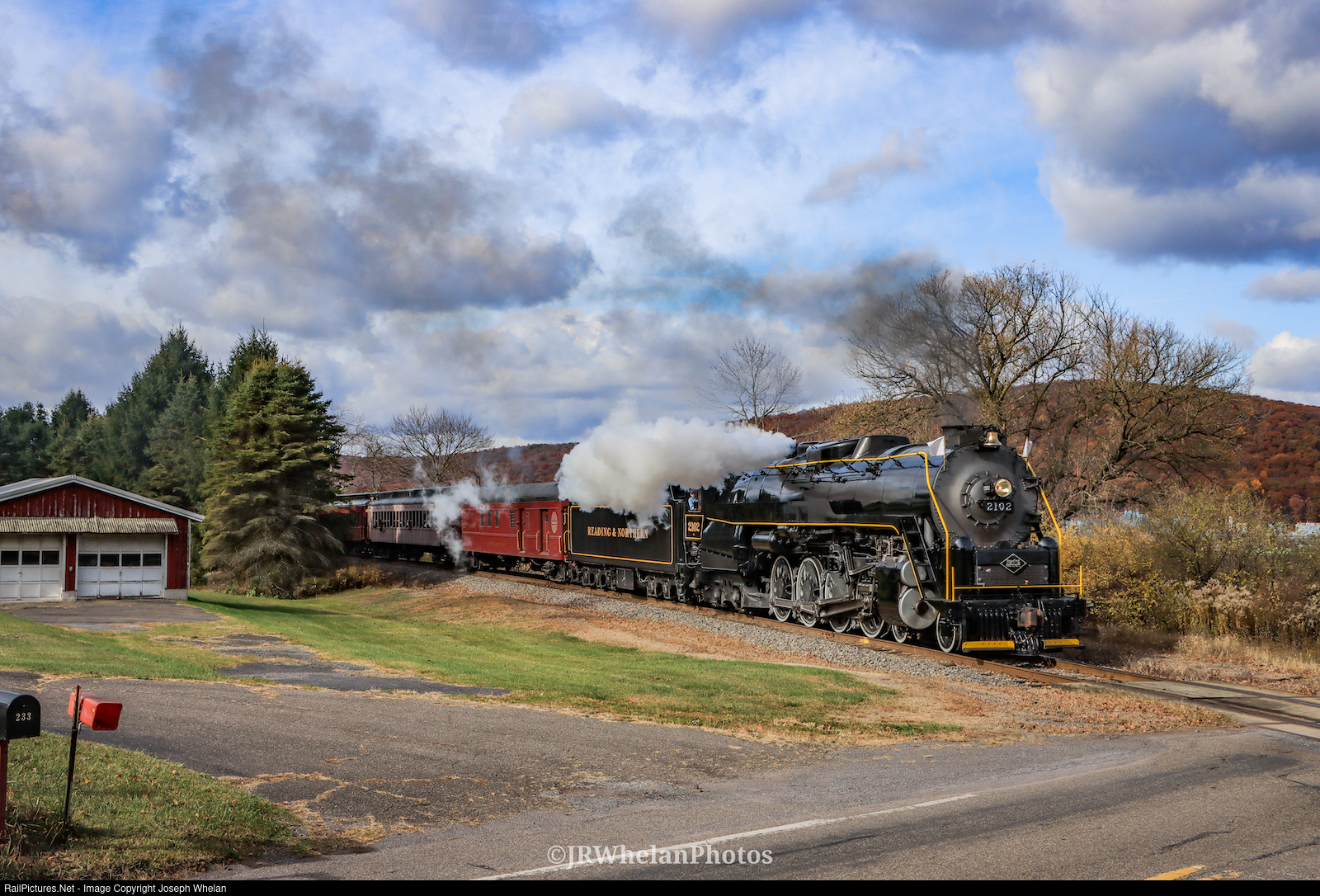 Reading & Northern 2102 leads a sold out Fall Foliage train through the quaint fields of Hometown, PA