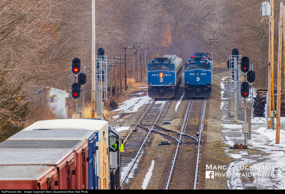 Meet Me At HALL. It was quite the crowded house around HALL interlocking in Campbell Hall, New York on the MTA Metro-North/New Jersey Transit Port Jervis line on the morning of February 17, 2022 as four trains pass through the scene. In the foreground, Middletown & New Jersey's CH-1 job sits with box cars and leased NJTR 4301 (GP40) leading as F40PH-3C MCNW 4912 faces leading Train 43. On the right, having been combined due to mechanical issues, Train 56/58 with F40PH-3Cs MNCW 4914 and 4909 heads towards Hoboken.